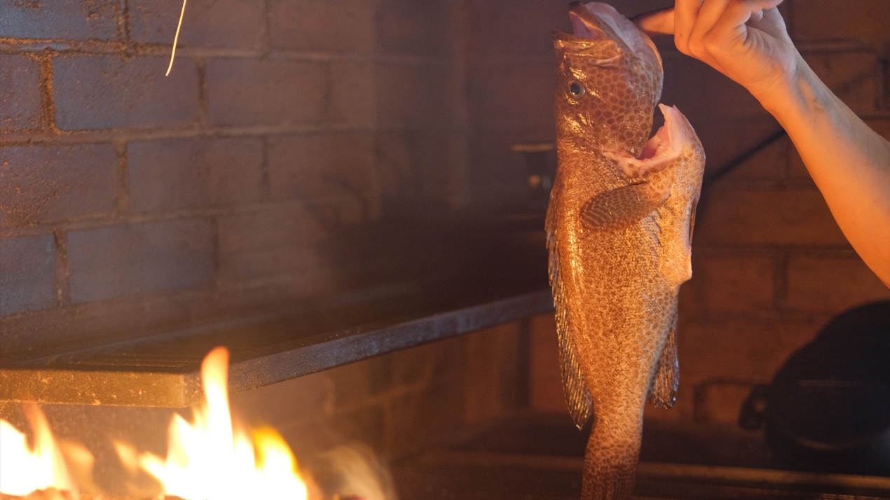 水分を含む薪は、炭とは異なり、燃え、素材を炙りながらも、自身のもつ水分を蒸発させ、スチームのように蒸し焼きにします。素材の外側は燻香をまといながら香ばしく、中心部はみずみずしく。