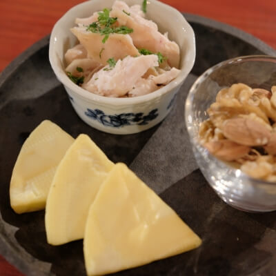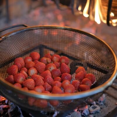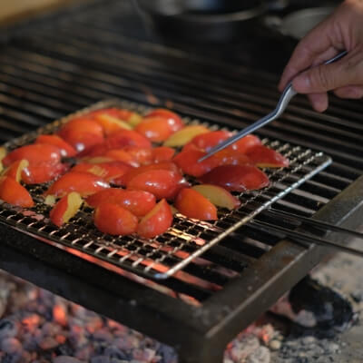 薪火料理は、これまで体験したことがないほどに、素材の旨みを引き出す魔法の料理法です。かつて、炭焼きが盛んであった西伊豆の山には、柔らかな炎が長く燃え、薪火料理に適した広葉樹(サクラ、ナラ、シイなど)が多く、まさにこの土地に適した料理法だと私たちは考えています。